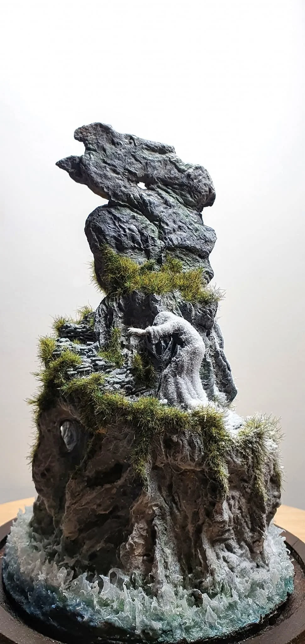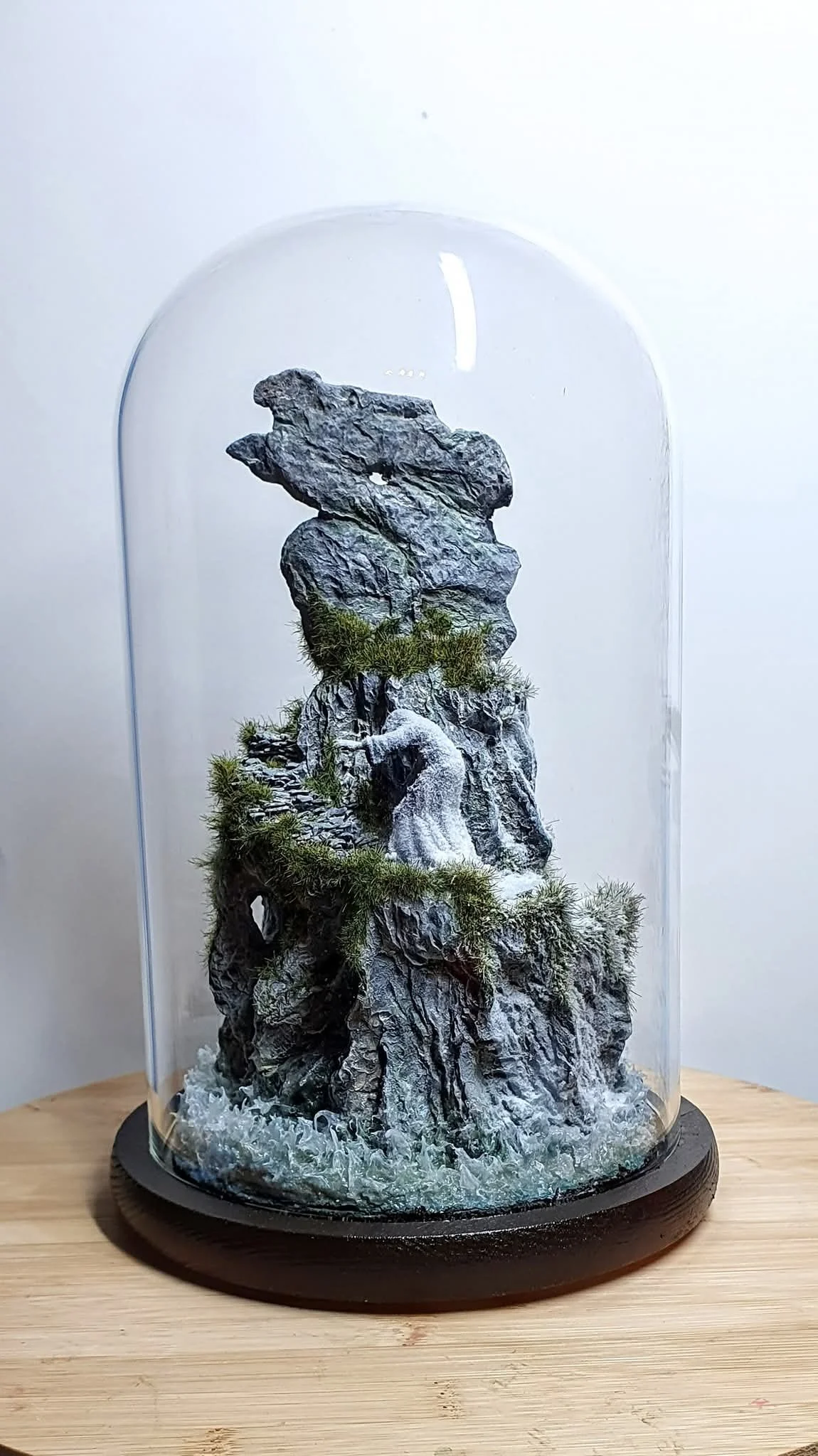 This unique piece stands at 11.2 inches inside the glass cloche, and 6" across at the base. It is created in ceramic clay with acrylics, statics and resins.